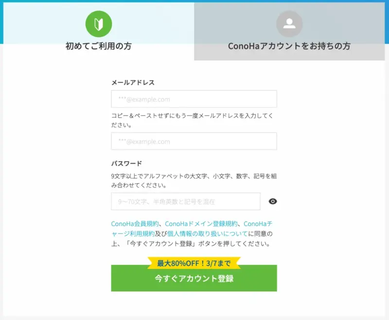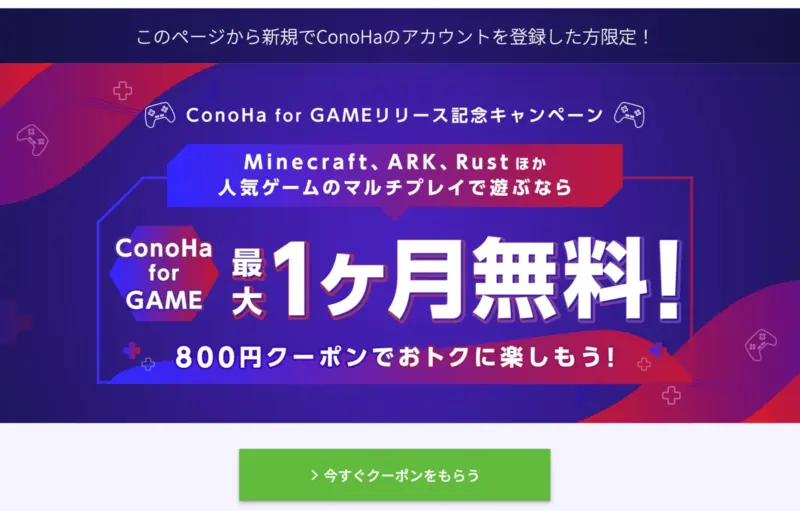まずはConoHa for GAMEへアクセスしましょう。上記リンクから会員登録することで800円分のクーポンをもらえます。新規の方のみなので注意して下さい。