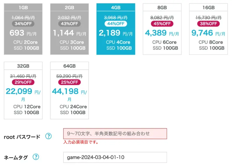 | プラン | 上位プランは隠れているので注意してください。ゲームによっては4GB以上のものがあるので、1GBと2GBは選択できない場合があります。 |