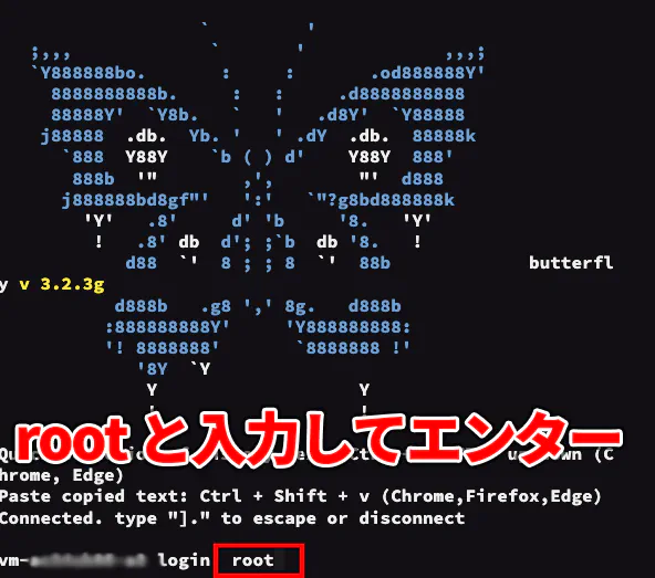 蝶のようなアスキーアートが表示されるはずです。この画面になったら下記の手順を進めます。