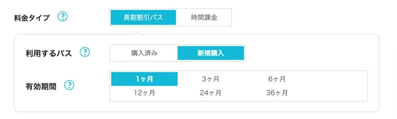 料金タイプを選択します。基本は「長期割引パス」を選択します。3日だけなど超短期間の場合は「時間課金」を選びましょう。時間課金は割引が一切されないため、一定時間を超えると1ヶ月契約より高くなります。