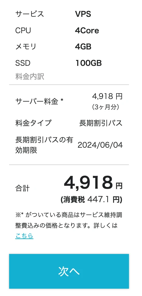「次へ」を押すと最終確認で決済画面に移動します。支払いが済めばサーバー作成の完了です。