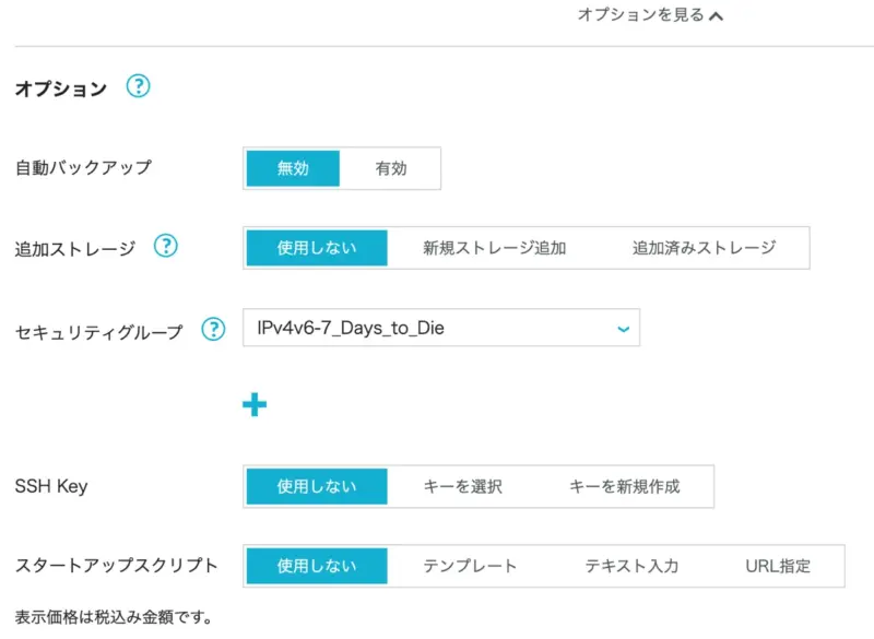| セキュリティグループ | 端的に言えば許可するIPアドレスやポートの指定です。デフォルトで選択しているゲームテンプレートのセキュリティグループがセットされます。 固定IPからしか接続できなくしたい場合などに追加でセットします。 後から設定できます。 |