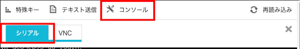 初めの状態はVNCと呼ばれるモードです。PCのOSやブラウザなどの環境によっては文字入力を受け付けない場合があるので、画面上メニューからコンソール>シリアルを選択して入力モードを変更します。