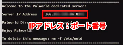 上記のようなテキストが表示されたらVPSサーバへログインが完了です。rootへログインすると「IPアドレス:ポート番号」が表示されます。ポート番号はゲームテンプレートインストール時にそのゲームのポート番号を設定してくれています。また、IPアドレスはConoHa管理画面のサーバー名の横にも記載されているのでコマンドで調べる手間は必要ありません。