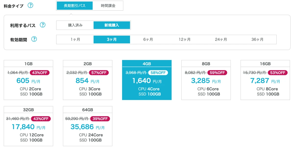| コア数 3〜24コア メモリ数 2〜64GB メディア NVMe SSD |